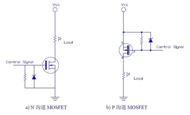 负载(Load)的连接方式决定了所选MOSFET的类型,这是出于对驱动电压的考虑。当负载接地时,采用P沟道MOSFET;当负载连接电源电压时,选择N沟道MOSFET。
