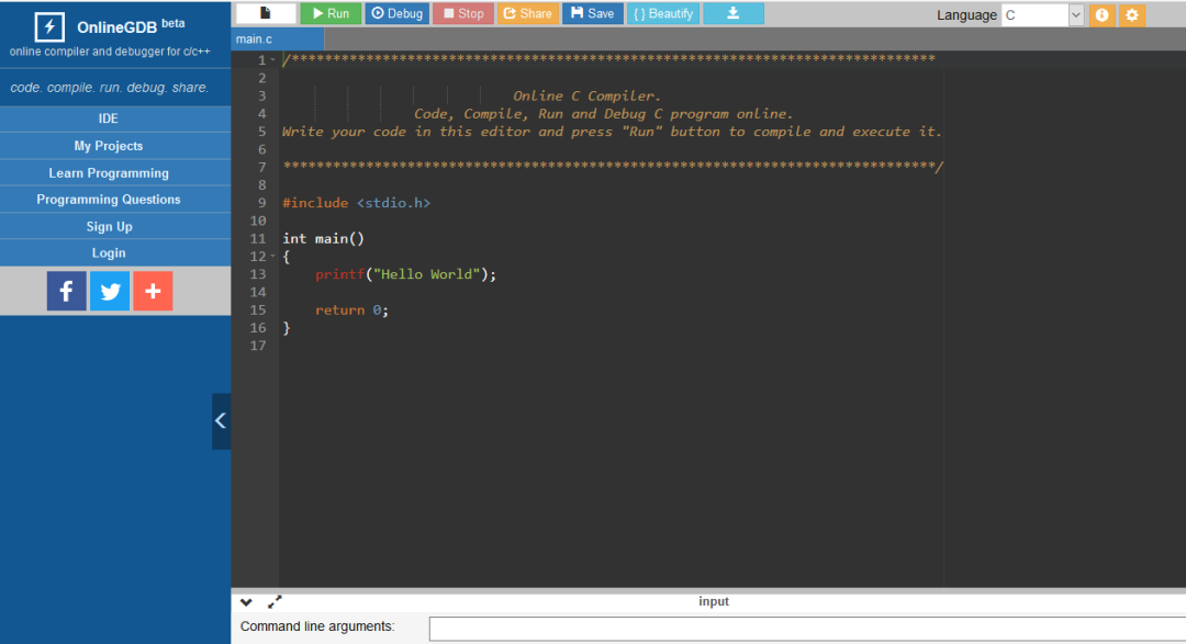 这款在线编译器支持C,C ++,PHP和Java编译器。OnlineGDB的独特功能是可以逐步调试您的代码,一旦代码被写入,它可以很容易地格式化,让它看起来非常酷。网站地址:https://www.onlinegdb.com/online_c_compiler