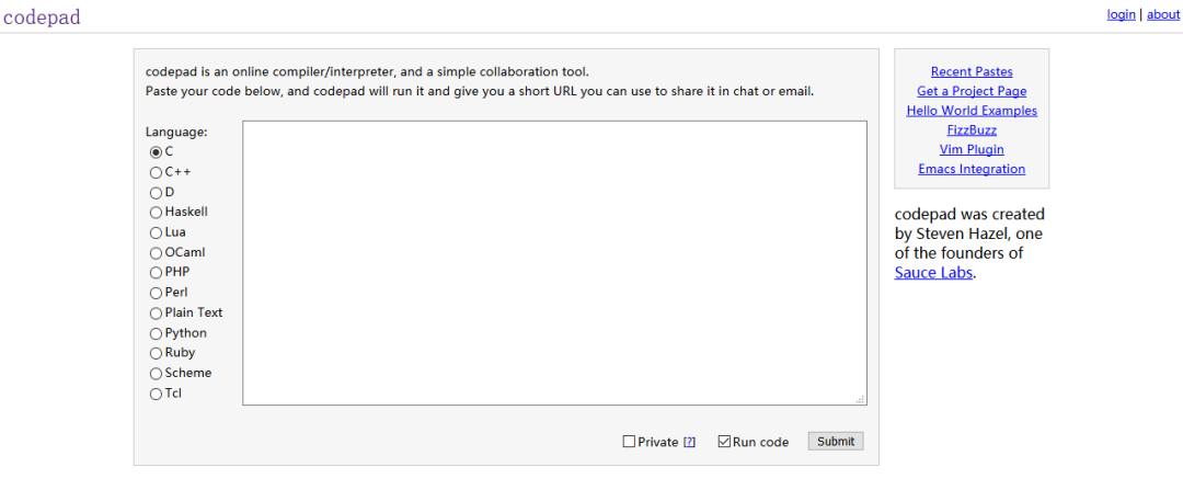 codepad.org是一个提供在线编译/调试工具的网站,你可以将代码复制到这里,然后运行,就会生成一个URL连接,将此URL连接通过邮件发送至你的挚友来求助。codepad还提供移动设备版,让你可以随时分享代码。网站地址:http://www.codepad.org/