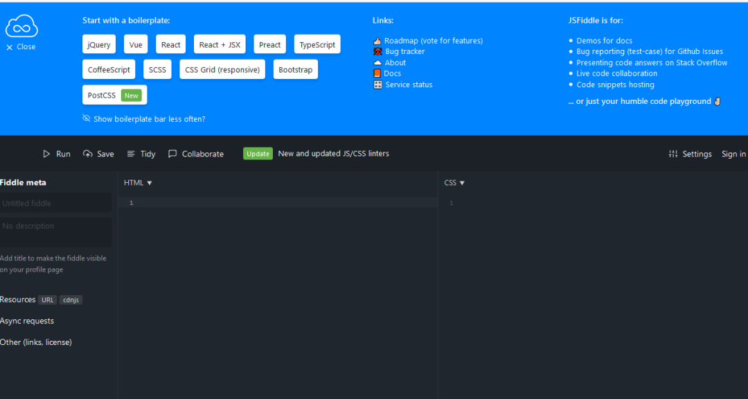 JSFiddle代码编辑器可以进行在线测试JavaScript,CSS,HTML或CoffeeScript(JavaScript,MooTools,jQuery,Prototype,YUI,Glow和Dojo)。网站地址:https://www.jsfiddle.net/
