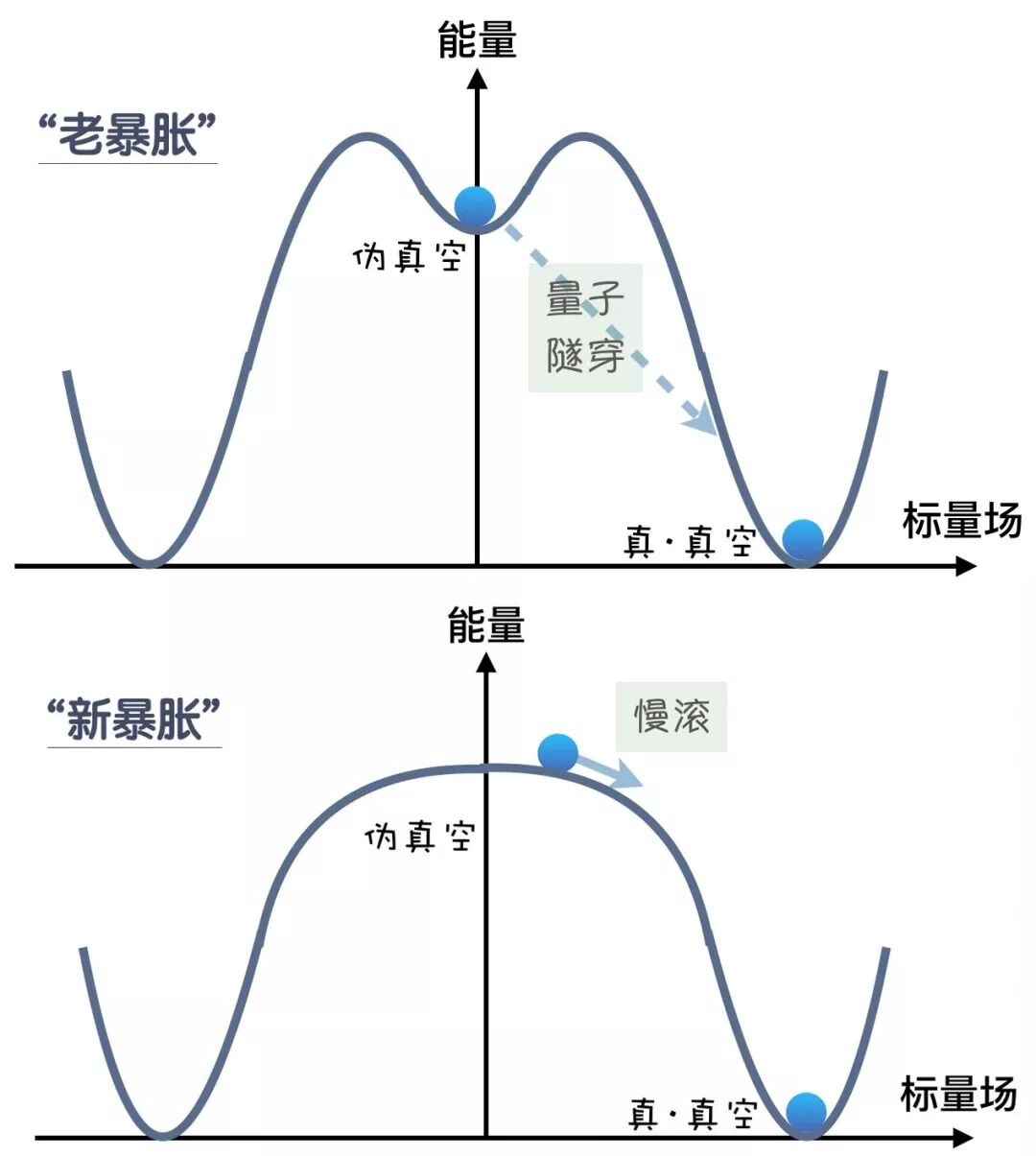 图6. 老暴胀(对应图5中的真空衰变)vs新暴胀(对应图5中的连续相变)