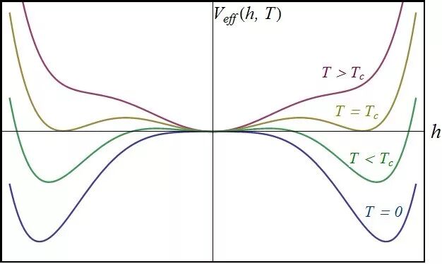 回到量子场论,我们上文提到的量子场(比如希格斯场)的真空态其实可以看作是我们世界所处的一种“相”。那么就有可能存在不同的真空态来组成宇宙的另外一种“相”。因而物理学家认为,类似于“水结冰”的现象曾经在整个宇宙的尺度上发生过,也就是宇宙相变。还是以我们的老朋友墨西哥帽来举例子,这一次我们只看帽子的一个截面,但却要考虑到这是一顶有温度的帽子。这时我们发现,由于量子场论中温度对墨西哥帽势能的修正,真空态的位置的确发生了变化。如图4所示,没有温度的势能是我们所熟悉的墨西哥帽。但当温度比较高时,帽子的形状就完全变掉了,能量最低的真空变成了原来帽子顶端具有完整对称性的状态。