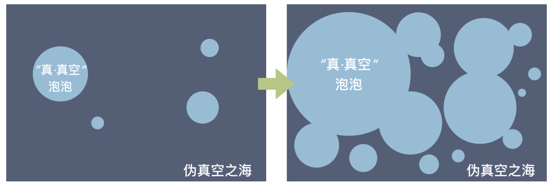 因而在极为炽热的婴儿宇宙时期,宇宙的确曾经是一个对称性没有破缺的“美丽的田园”,后来随着温度降低,势能的形状逐渐变成了我们所熟悉的墨西哥帽,新的真空态形成了,原来帽顶那个“很对称的真空态”不再是真的真空态,我们称之为“伪真空”。宇宙原本处于“伪真空”的海洋之中,这时,真空衰变发生了:一小片区域跃迁到了能量更低的“真·真空”,形成了一个小的真空泡,然后越来越多的真空泡出现在伪真空之海中,它们不断膨胀和碰撞,直到整个宇宙都被“真·真空”所取代。