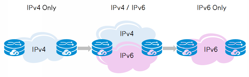 IPv6在1992年被提出,经过二十多年的发展,已经是一个非常成熟的协议体系。但IPv6并不是IPv4的改进,而是一个全新的协议,也就是说它并不兼容IPv4,也就不可能一步到位全网替换IPv4。因此,最可行的方法是将IPv4分阶段逐步过渡到IPv6。