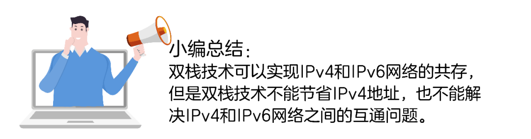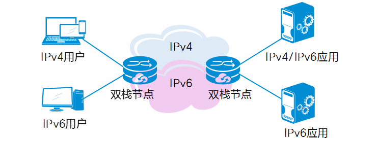 网络中的双栈节点同时支持IPv4和IPv6协议栈,与IPv4节点通讯时使用IPv4协议栈,与IPv6节点通讯时使用IPv6协议栈。