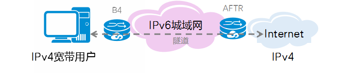 在实际应用中,DS-Lite是一种典型的IPv4 over IPv6隧道技术。DS-Lite技术由B4(Base Bridging BroadBand Element,通常为用户终端)和AFTR(Address Family Transition Router,地址族转换路由器)两个模块协作实施,B4和AFTR设备之间建立DS-Lite隧道,并在AFTR设备上配置NAT,实现IPv4用户穿越IPv6网络访问IPv4网络,同时NAT技术实现运营商级别IPv4地址复用,可以减少IPv4地址开销。