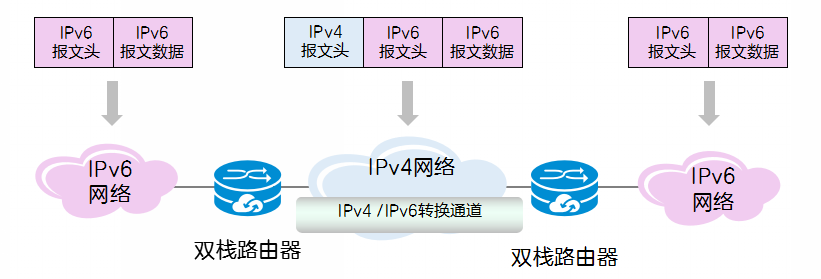 为了保障IPv4向IPv6的顺利演进,国际互联网工程任务组(IETF)成立专门工作组进行研究,形成了三类技术方案:双栈技术、隧道技术、协议转换技术。IPv6和IPv4是功能相近的网络层协议,两者都基于相同的物理平台,而且加载于其上的传输层协议TCP和UDP没有任何区别。