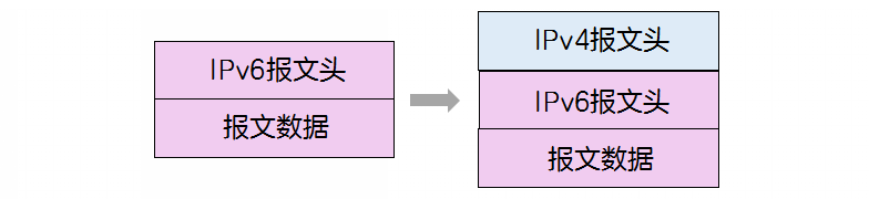 在IPv6报文通过IPv4网络时,需要进行“封装—解封装”的过程:1)隧道发送端将该IPv6报文封装在IPv4包中,将此IPv6包视为IPv4的负荷,在IPv4网络上传送该封装包。