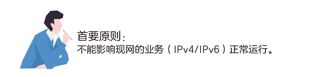 例如,当运营商的基础网络升级到IPv4/IPv6双栈,会给用户的终端分配IPv4和IPv6两个地址代替原来的一个IPv4地址,而客户终端优先使用IPv6协议实现网页、视频等应用。使用终端的客户并不感知这些变化,用户也不想知道运营商基础网从IPv4升级到IPv4/IPv6双栈的具体事宜。