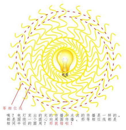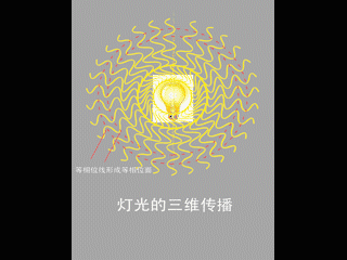 水波的传播依赖于介质,因此会局限于水面上,是二维的,因此连起来的等相位线是一个圆周。但是,光的传播依赖于电磁场的相互激发,其不需要介质,可在三维空间中自由传播。这些等相位线组成面,就是等相位面,它是以电灯为球心的同心球面。如下动图所示: