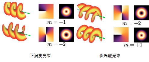 图中的m是涡旋光束的轨道角动量,也称为拓扑荷数,简单来说就是指围绕光束中心一周,相位的变化是2π的多少倍。自转的地球具有自旋角动量(SAM),绕太阳旋转的地球具有轨道角动量(OAM),光子也可以携带角动量——通过表现为偏振的自旋角动量,以及上述表现为螺旋等相位面的轨道角动量。这样的涡旋光束中的每个光子携带的轨道角动量可以传递给粒子,驱动粒子旋转,从而实现对粒子的捕获、平移。