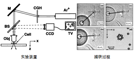 捕获过程:涡旋光束聚焦到水中的空心玻璃球,玻璃球开始旋转,然后逐步向光环中心靠拢,在涡旋光束比较强并且粒子比较小的情况下,涡旋光束会将粒子束缚在光束光环上。当粒子比较大,光束不强时,粒子会旋转着向光束的中心暗核靠拢,最终被捕获在光束中心。当粒子比较小,光束很强时,由于强光强区域的梯度力,会使粒子被捕获在光束的亮环上。