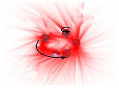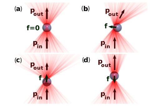 对于小颗粒,由光散射产生的力,即动量反冲力占主导地位。对于紧密聚焦的涡旋光束,散射力的主要分量在于光束传播的方向,而梯度力再次将粒子约束到最大光束强度的环上。然而,由于涡旋光束强度分布是圆柱对称的,因此粒子不受方位角的约束,而可能被捕获在最强光环的任意位置。较大颗粒会与光束内在自旋和外在轨道角动量相互作用使颗粒围绕着光轴旋转的同时自转。由于颗粒较大,其受到的梯度力相对较小,因而不会被束缚在光环上,而是慢慢旋转到光束中心的暗核附近。