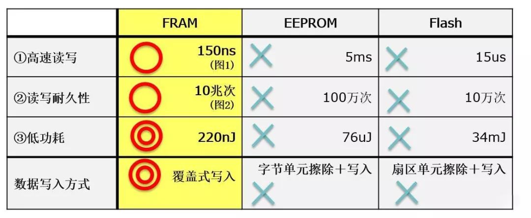 当前的富士通FRAM主要具备三大优势:高读写入耐久性、高速写入以及低功耗,这是绝大多数同类型存储器无法比拟的。比如,FRAM写入次数寿命高达10万亿次,而EEPROM仅有百万次(10^6)。富士通FRAM写入数据可在150ns内完成,速度约为EEPROM的1/30,000。写入一个字节数据的功耗仅为150nJ,约为EEPROM的1/400,在电池供电应用中具有巨大的优势。