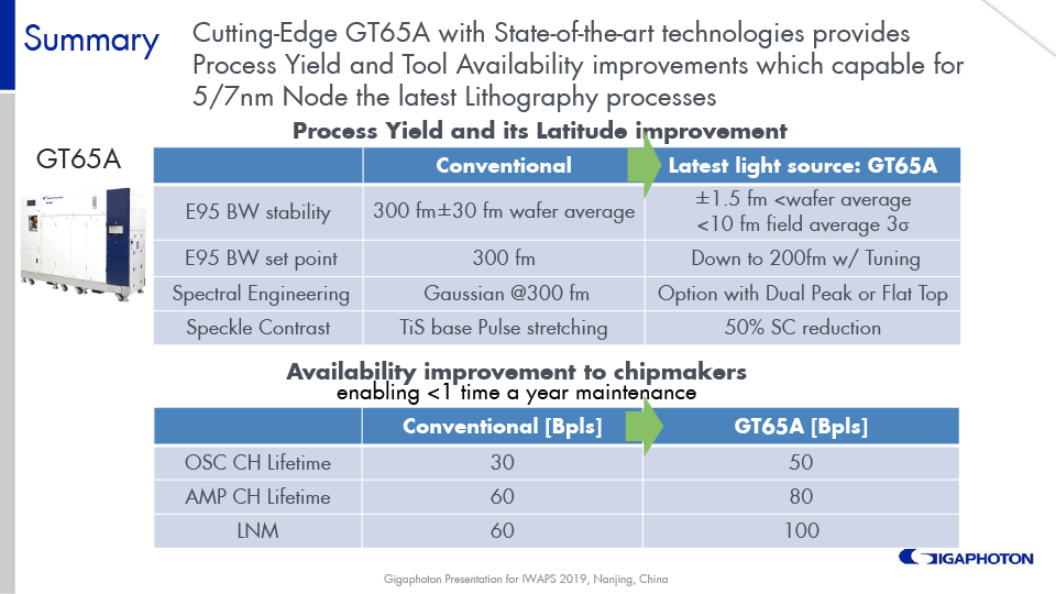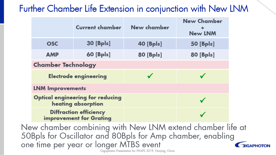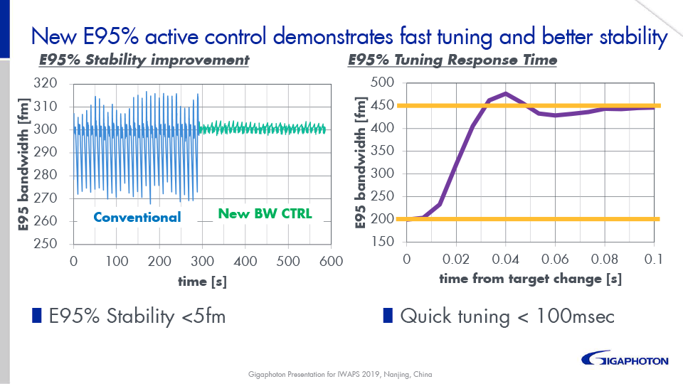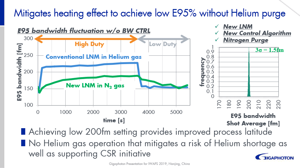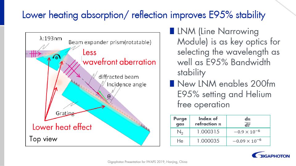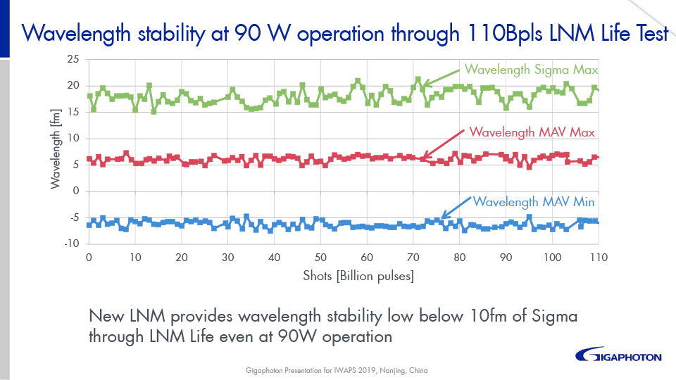 报告介绍了最新的线宽压窄模块(line narrowing module,LNM),该模块能够减少光学元件和机械部件在激光照射期间的热效应,将E95%带宽从标准的300fm减小到200fm。此外,LNM中的新型光学设计使其的使用寿命从60 Bpls延长到110 Bpls。因此,GT65A能够最大程度地提高生产效率,为芯片制造商提供最佳的运营成本。