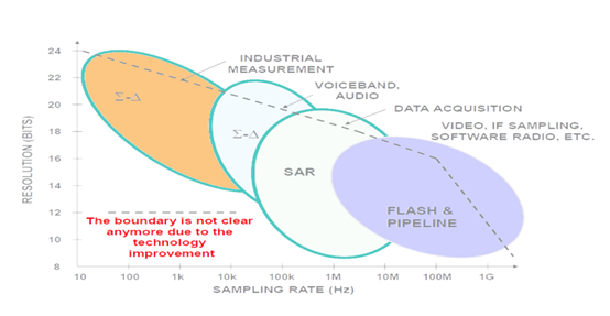ADC的设计参考的架构分别是以上几种:Flash&Pipeline,SAR ,Σ-∆几种方式,而ADC的性能指标分别有采样精度和采样速率。