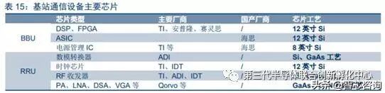美国厂商垄断大功率射频器件。具体来看,目前 RRU 设备中的 PA、LNA、DSA、VGA等芯片主要采用砷化镓或氮化镓工艺,来自 Qorvo、Skyworks 等公司,其中氮化镓器件通常为碳化硅衬底,即 GaN on SiC。RF 收发器、数模转换器采用硅基及砷化镓工艺,主要厂商包括 TI、ADI、IDT 等公司。以上厂商均为美国公司,因而通信基站芯片对美国厂商依赖性极高。