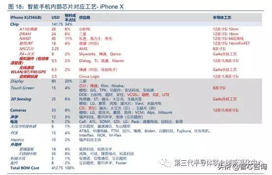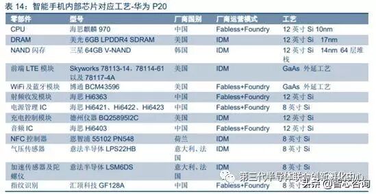 智能手机核心芯片涉及先进制程及化合物半导体材料,国产率低。以目前国产化芯片已采用较多的华为手机为例可大致看出国产芯片的“上限”。CPU目前华为海思可以独立设计,此外还包括小米松果等 fabless 设计公司,但由于采用 12 英寸最先进制程,制造主要依赖中国台湾企业;DRAM、NAND 闪存国内尚无相关公司量产;前端 LTE 模块、WiFi 蓝牙模块采用了GaAs 材料,产能集中于 Skyworks、Qorvo 等美国 IDM 企业以及稳懋等中国台湾代工厂,中国大陆尚无砷化镓代工厂商;射频收发模块、PMIC、音频 IC 可做到海思设计+foundry 代工,而充电控制 IC、NFC 控制 IC 以及气压、陀螺仪等传感器主要由欧美 IDM厂商提供。总体来看智能手机核心芯片国产率仍低,部分芯片如 DRAM、NAND、射频模块等国产化几乎为零。