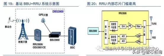 通信基站对国外芯片依赖程度极高,且以美国芯片企业为主。目前基站系统主要由基带处理单元(BBU)及射频拉远单元(RRU)两部分组成,通常一台 BBU 对应多台 RRU 设备。相比之下,RRU 芯片的国产化程度更低,对于国外依赖程度高。这其中主要难点体现在 RRU 芯片器件涉及大功率射频场景,通常采用砷化镓或氮化镓材料,而中国大陆缺乏相应产业链。