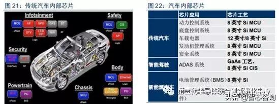 汽车电子对于半导体器件需求以 MCU、NOR Flash、IGBT 等为主。传统汽车内部主要以 MCU 需求较高,包括动力控制、安全控制、发动机控制、底盘控制、车载电器等多方面。新能源汽车还包括电子控制单元ECU、功率控制单元PCU、电动汽车整车控制单元VCU、混合动力汽车整车控制器 HCU、电池管理系统 BMS 以及逆变器核心部件 IGBT 元件。此外在以上相关系统以及紧急刹车系统、胎压检测器、安全气囊系统等还需应用 NOR Flash 作为代码存储。MCU 通常采用 8 英寸或 12 英寸45nm~0.15μm 成熟制程,NOR Flash 通常采用45nm~0.13μm 成熟制程,国内已基本实现量产。
