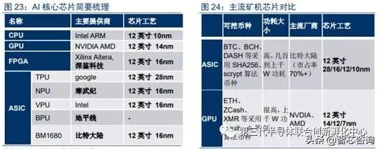 AI 芯片与矿机芯片属于高性能计算,对于先进制程要求较高。在 AI 及区块链场景下,传统 CPU 算力不足,新架构芯片成为发展趋势。当前主要有延续传统架构的 GPU、FPGA、 ASIC(TPU、NPU 等)芯片路径,以及彻底颠覆传统计算架构,采用模拟人脑神经元结构来提升计算能力的芯片路径。云端领域 GPU 生态领先,而终端场景专用化是未来趋势。根据 NVIDIA 与 AMD 公布的技术路线图,2018 年GPU 将进入 12nm/7nm 制程。而目前 AI、矿机相关的 FPGA 及 ASIC 芯片也均采用了10~28nm 的先进制程。国内厂商涌现了寒武纪、深鉴科技、地平线、比特大陆等优秀的 IC 设计厂商率先实现突破,而制造则主要依靠台积电等先进制程代工厂商。