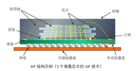 图 2:SiP 结构示例(五个堆叠芯片的 SiP 技术)