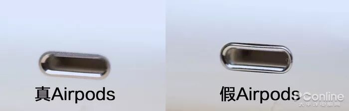 在我开启了写轮眼之后还发现,正品充电口的边缘是CNC切割的铝合金材质,而山寨airpods的是镀铬的塑料材质。