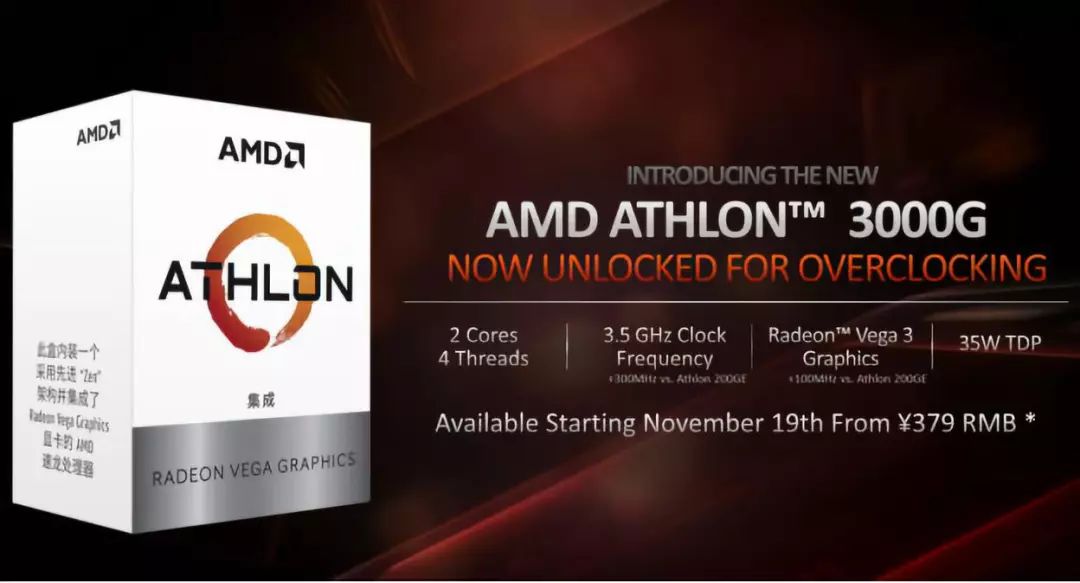 AMD 还公布将于 2019 年 11 月 19 日上市全新速龙 3000G 处理器,为主流台式机用户带来显著的性能提升和坚实可靠的计算体验,这款搭载 Radeon 显示核心的处理器从日常使用到高清PC游戏均可胜任。AMD 速龙 3000G 是首款基于“Zen”架构的速龙产品,可以提供更高游戏帧数和更强的生产力表现,并且采用了不锁频*设计,可为超频*提供潜能,它是同级别处理器中唯一不锁频*的产品。