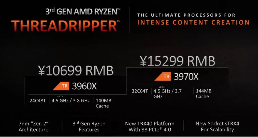 第三代 AMD 锐龙 Threadripper 系列包括两款新品:它们均采用业界领先的 7 nm “Zen2”内核架构,拥有多达 88 条 PCIe 4.0 通道和 140 MB / 144 MB 高速缓存,具备非凡能效比。其中全新 32 核锐龙 Threadripper 3970X 处理器是 HEDT 市场上同时兼具顶级速度和极致性能的台式机处理器。