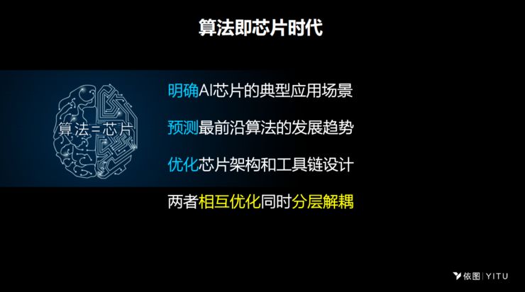 在这样的情况下,依图提出了一个核心的概念——算法即芯片。什么是算法即芯片?我们要做一款有竞争力的AI芯片的时候,要非常明确这个AI芯片典型的使用场景。