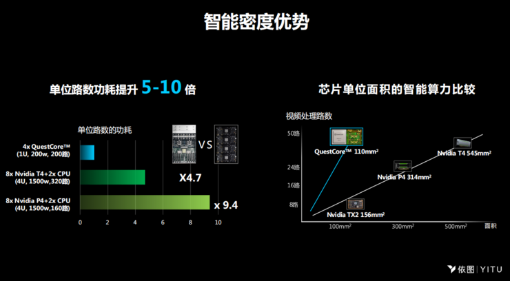 对比市场上通常用的CPU+GPU的架构,同样处理单路的视频,完成同样的功能,依图AI芯片所需要的功耗能够大概降低到市面上最先进GPU解决方案的1/5到1/10。另外一个维度是芯片的单位面积的智能算力,直接量化下来是能处理的路数,斜率越大,表示效率越高,依图的斜率远远大于市面上其他的斜率。