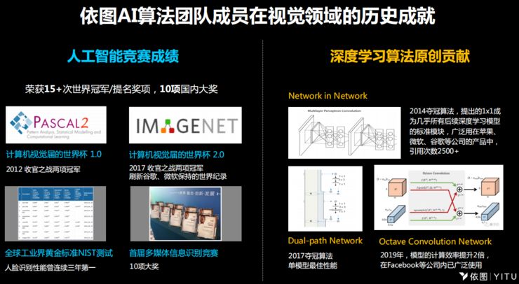 我觉得评价一家公司AI能力,一方面是在比赛中获得的成绩,更重要的是你的团队有没有为这个社会留下有价值的AI的算法。依图的团队,比如说我们的创始人,他是做层次学习的,这一块他的成就对整个视觉分析起到了非常重要的作用。到了深度学习时代,比如说我们团队以前提出的1×1的卷积,也就是Network in Network,这是视觉计算里面几乎所有人都会用到的模块。还有一个刚刚加入到依图的同事,也是我的学生,他提出1/8卷积,将视觉分析的速度进行了加速,并且精度没有损失,他也是2017年ImageNet收官之战的冠军。依图的团队既在比赛中有很好的成绩,同时也为这个领域的发展提供了不少的原创性研究成果。