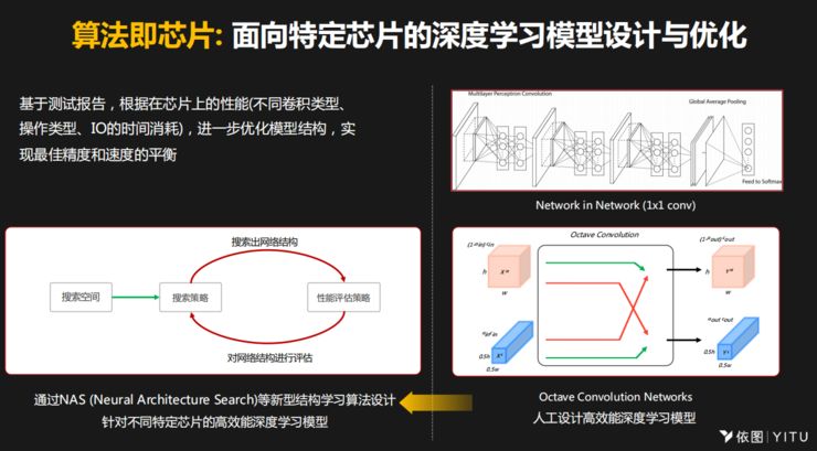 算法开发者根据测试报告就知道自己的算法,比如说在卷积类型、操作类型、I/O的时间消耗等,他可以进一步优化模型结构。大家知道要得到一个好的模型,其实有两个维度,一个是通过人工设计的方式去设计深度学习的基础模块,比如说我的团队提出的1×1卷积。