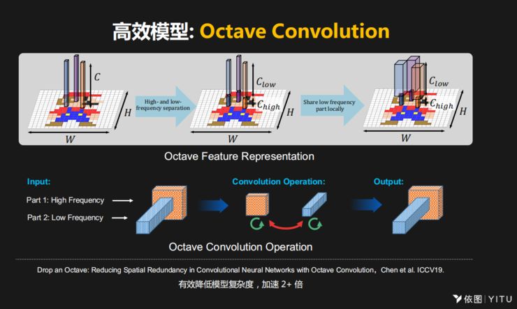 另一个是把一些优化和消耗的元素引入到系统里面,用NAS的方式去搜索适合各种芯片的高效的深度学习模型。比如说1/8卷积,基于这个思想,把特征层变成异构化,既有大尺寸,也有小尺寸,相应的设计不同特定类型的卷积操作,最后得到的卷积也是异构的。通过这种方式,把模型的尺寸变小,但不会影响应用。因为模型变小,它的推广性能将会提升,在训练的时候消耗的计算资源也会降低。这个模型在不同的硬件上测试,基本上都能实现标准的加速。