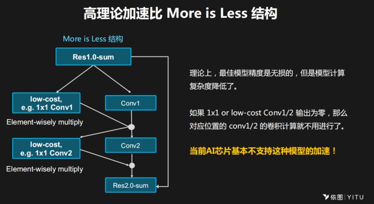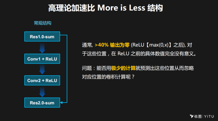 我在2017年做了一个More is Less结构。它的思想是,现在的深度学习卷积完成后,有40%的ReLU输出为零,这样ReLU具体值的大小是没有意义的,于是我们想有没有办法用极少的计算定位出问题。于是我们就为每一个卷积操作设计了一个配套的低功耗的卷积操作,这样在理论上这个模型精度是没有任何损失的,但是它的计算速度会大大提升。