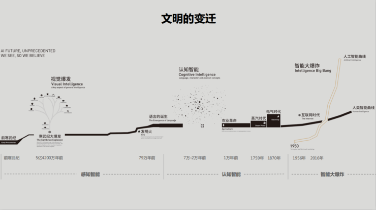 在文明的发展过程中,人类的智能化已经到了一个很高的水平。但是在另一个维度,还有一个新物种,就是人工智能。它在过去60多年的时间里,有了飞速的发展。就像刚才的嘉宾介绍的,人工智能最重要的发展点是2016年AlphaGo战胜了人类的围棋世界冠军,让我们想象到以后人工智能将会有更大的发展,因此在思考“人工智能的发展将超越人的智能”这个奇点的到来。