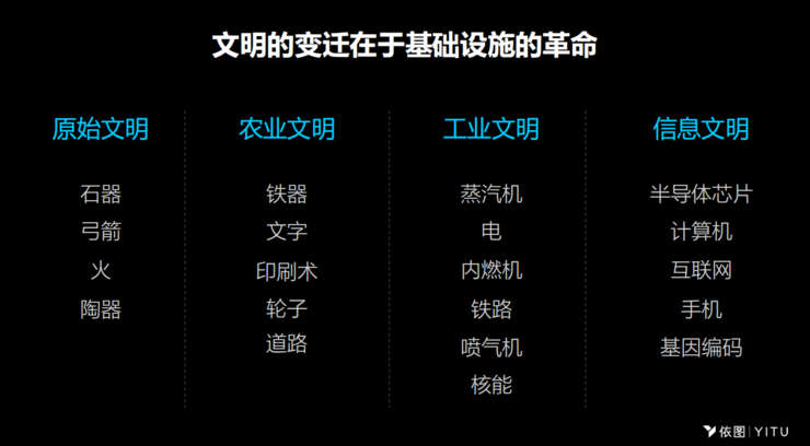 比如说在原始社会我们只有弓箭、火;农业社会,有了道路和轮子,可以快速和别人沟通交流。工业社会,有内燃机、铁路,人和人沟通的效率又有更大的提高。到了信息社会,我们不需要进行人的迁移,通过互联网就可以在任何时间、任何地方跟其他人进行交互——核心点都是因为基础设施发生了巨大的变化。