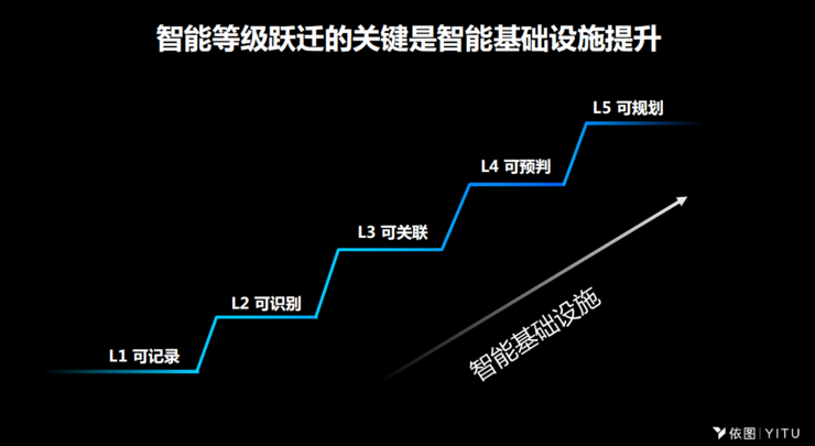 从L1到L5发展的过程,也是基础设施不断提升的过程。比如说在城市管理里面,当摄像头的数量从5000个上升到20万的时候,我们能为城市的管理者所提供的能力将会有大幅的变迁。