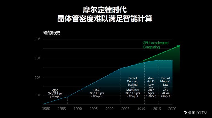 一是因为摩尔定律的时代已经结束。前面在很长一段时间里面,大家相信每18到24个月,在同样面积芯片上能够承载的晶体管的数目会翻一番,但是在最近几年,这个定律已经不再适用。另一方面,GPU加速的AI计算的算力大幅提升。