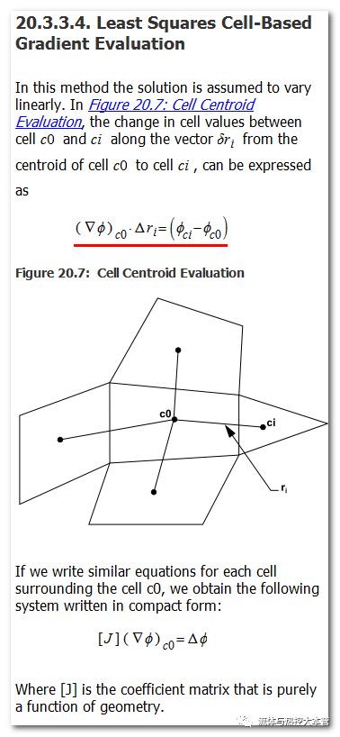Least Squares Cell-Based,顾名思义,基于网格中心(Cell-Based)计算,。两个相邻网格中心量的变化等于两个中心量乘以方向。下图是来自Fluent 15.0帮助文档的解释。