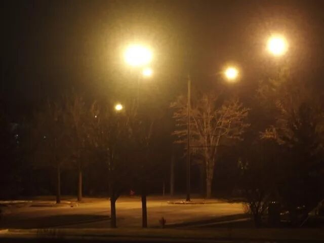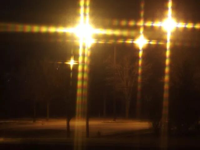 同样的景色,如果隔着纱窗拍摄,就会得到下面的照片。我们看到远处的灯光朝四个方向展开。这些光芒是一段一段的,每一段都呈现彩色。窗纱是方格状的,是一种二维光栅,因此其衍射干涉的图样是向四个方向延伸的。