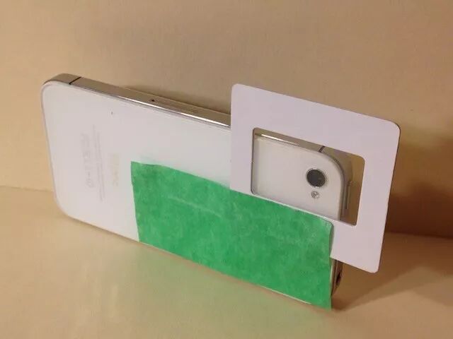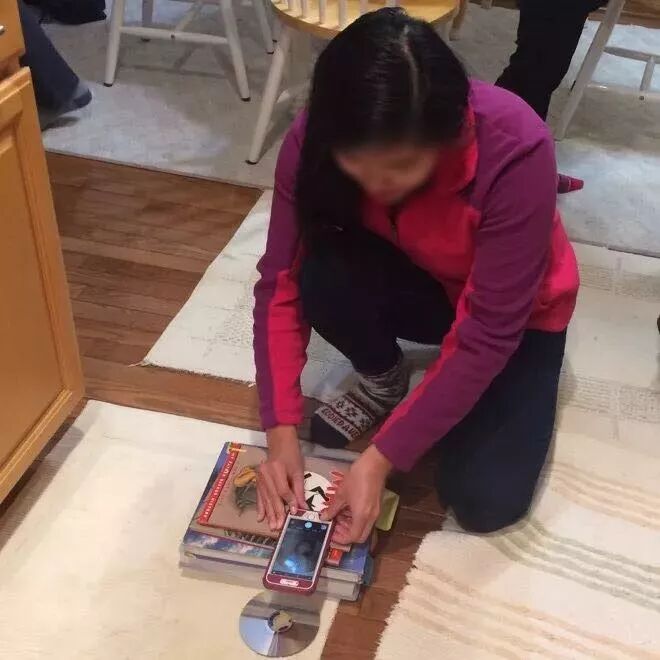 将手机平放在书堆上,以保持稳定,且镜头垂直向下,对着光盘的中心。细心地调整手机与光盘的相对位置,就可以看到光盘上显示出了发光二极管的光谱。