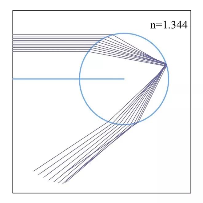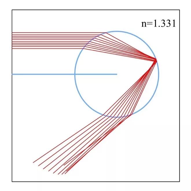 太阳光照在水珠的不同位置,其入射角从0 到90 度都有可能。因而光线离开水珠的出射角A 也有多种可能值。不过,出射角存在一个最大值,这个最大值在 41度左右。不同颜色的光,其出射角的最大值也不相同。我们可以想象,对于某一种颜色的光,有很多条光线堆积在最大出射角附近,因而在不同的观察角上,我们就可以看到水珠呈现出某一种特定的颜色。