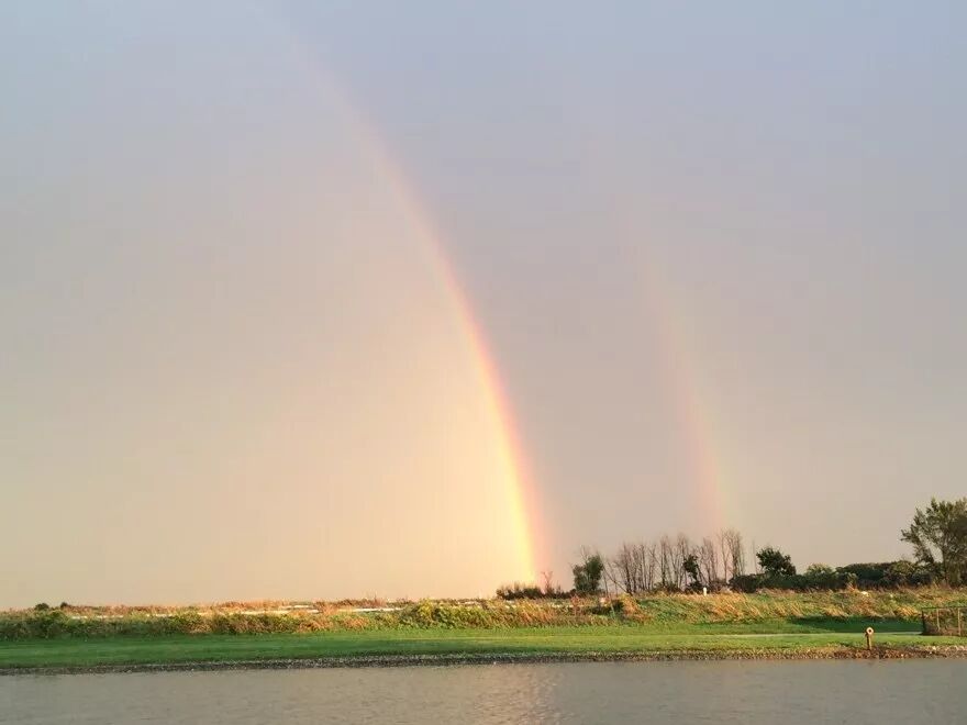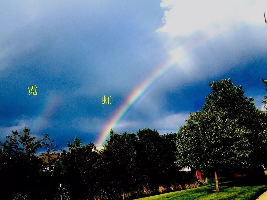 大家如果仔细看,不难发现霓与虹的色彩关系是正好相反的。虹的红色在外圈,紫色在內圈,而霓则反之。此外,霓比虹通常要更暗,这是由于霓比虹在水珠中要多经过一次反射。