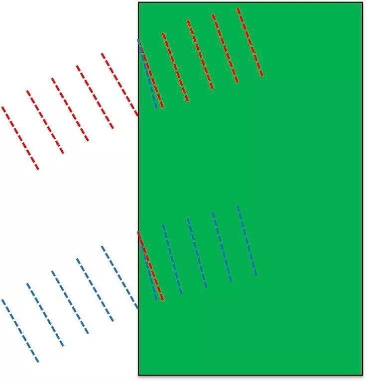 水泥地面平整坚硬而草地则很松软,于是一个横排中,先走进草地的同学行进速度瞬间变慢。这样一来,横排的方向由此改变,整个队伍的行进方向也随之偏折,这对应于光学中的折射现象。假如有红队和蓝队两组学生,在草地中蓝队行进速度比红队慢,这样蓝队偏折的程度就会比较厉害。如果开始时两队在水泥地面的行进方向相同,那么到草地上的行进方向就会不同,这对应于光学中的色散现象。