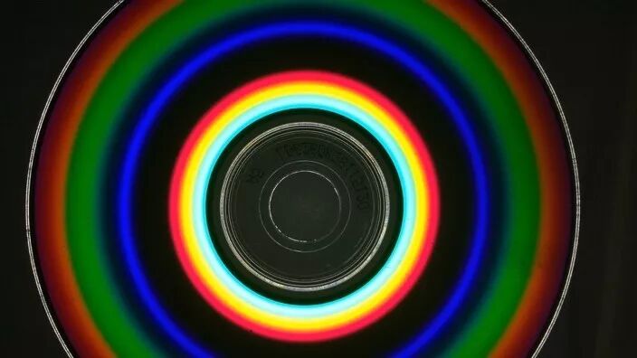 窗纱每根丝之间的间距比较大,因此极大之间的夹角相对比较小,因此我们可以在一个不大的角度范围内看到很多个极大。不过,由于极大之间的夹角比较小,因而用肉眼观察时往往不易发现光芒中存在的彩色。这就是为什么我们的照相机要用长焦镜头,长焦镜头起到放大视角的作用。实际上,我们用望远镜来观察远处的夜景,也可以看到同样的现象,望远镜也是一种放大视角的装置。早几年,我们用光盘来存储音乐,电影或其他数据。光盘上有着很细密的圆形刻纹,因此是一种很好的环形光栅。利用光盘,可以做很多有趣的光谱分析实验。大家可以带着孩子做个简单的实验。将一个光盘平放在桌面或地面上,旁边放一叠书。把手机照相机开到拍摄视频的模式,并且打开照明用的发光二极管。