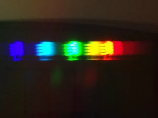 各种气体在节能灯的灯管当中放电,这种情况下往往会激发出若干很强很窄的谱线。从某种意义上说,我们看到的节能灯,实际上可以看成是有很多个不同颜色的节能灯叠合而成的。经过光栅,这些不同颜色的光,向着若干不同的角度传播出去。这样一来,我们就可以拍摄到上图中的这种现象。