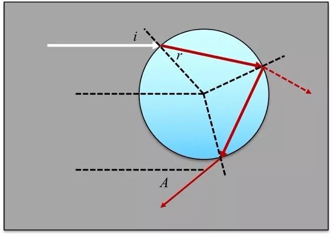 光线在进出空气与水的界面时,经历两次折射。由于水的色散,不同颜色的光就会折射到不同的角度。不过,光线照射到水珠的不同的位置,对应的入射角 i 是不同的,因而对于虹而言,其出射角A,(或者霓的出射角B)也相应不同,情况比棱镜要复杂得多。比如折射率比较低的红光,通过水珠后出射的光线如下图所示。