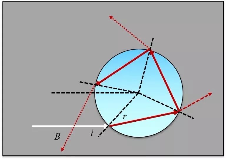 太阳光照射到水珠上某一点,入射光线与球面法线的夹角i 称为入射角。光进入水珠时,发生折射,折射角为r。光线射到水珠的后壁,一部分透出水珠,而另一部分反射回水珠。反射回来的光再次到达水与空气的界面,又有一部分透出来,一部分反射回去。这透出来的光,就是我们看到的虹。