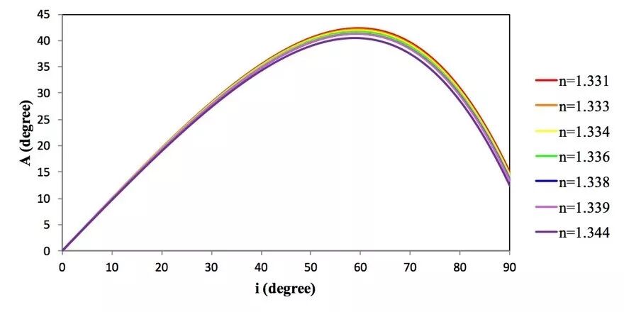 我们可以看出,不论是哪种颜色的光,光线的出射角A都会散布在一个很宽的角度范围中,这与棱镜是不同的。当然,紫色光的出射角总体来看要比红光的出射角偏小些,从下图我们可以看得更清楚些。
